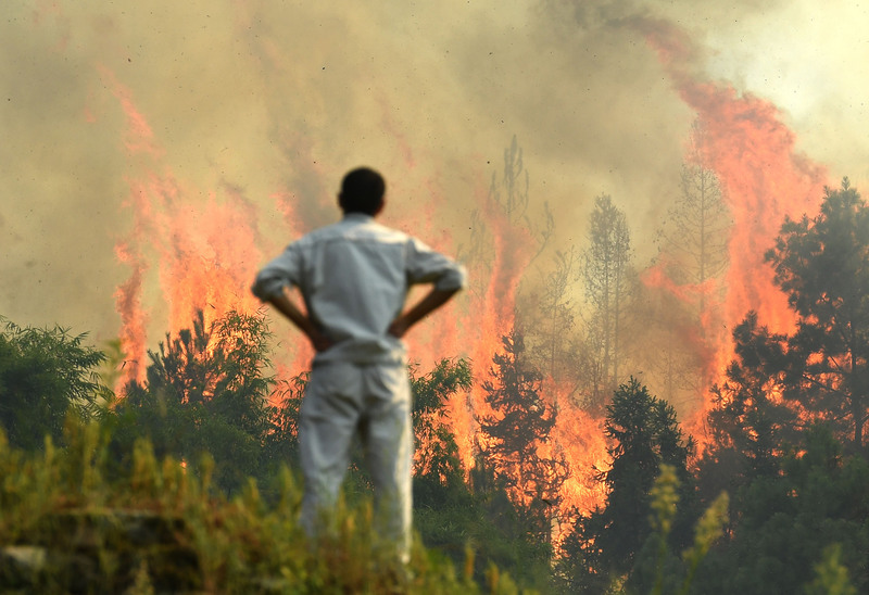重慶市18日測得攝氏45度,再破高溫紀錄。重慶因連日高溫限電缺水之際,這兩天還頻傳山林火災。圖為18日,重慶南川區神童鎮突發山火。(圖/中新社提供)