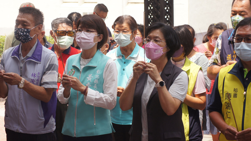 彰化縣長選舉形成女力對決,由現任的縣長王惠美(前右2)對上民進黨提名的立法委員黃秀芳(前左2),2人同場出席活動時,行禮如儀。(圖/中央社)