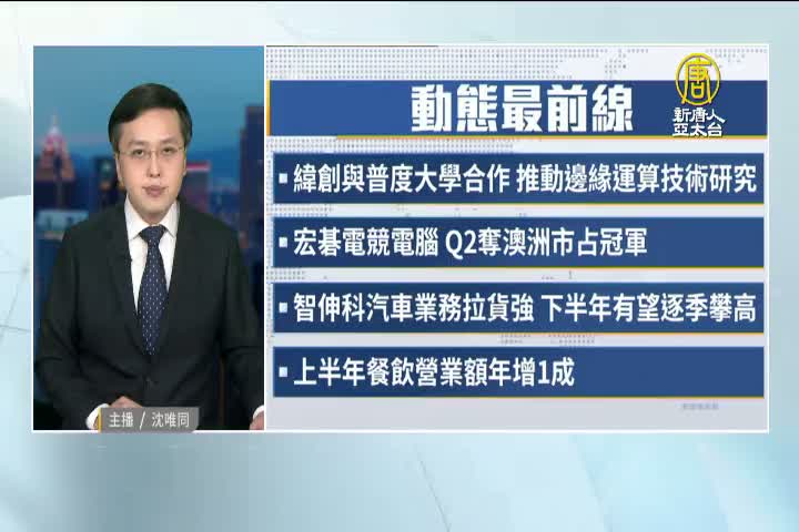 【新唐人亞太台 2022 年 08 月 22 日訊】接著帶您看到產業動態,代工廠緯創今天宣布,與美國普度大學共同簽訂前瞻技術研究計畫,針對開放式邊緣運算及智慧製造相關應用展開合作。品牌大廠宏碁今天表示,根據市調機構 IDC最新調查顯示,旗下電競產品在澳洲市佔率成為當地市場銷售第一。汽車動力及安全零組件大廠智伸科指出,下半年產業鏈逐漸復甦趕工;法人看好,第二季獲利創高後,第三、四季獲利有望逐季上揚。根據財政部統計,受惠疫情趨緩、外食消費增加,加上去年同期基期較低,餐飲業上半年營業額達3990億元,年增1成。