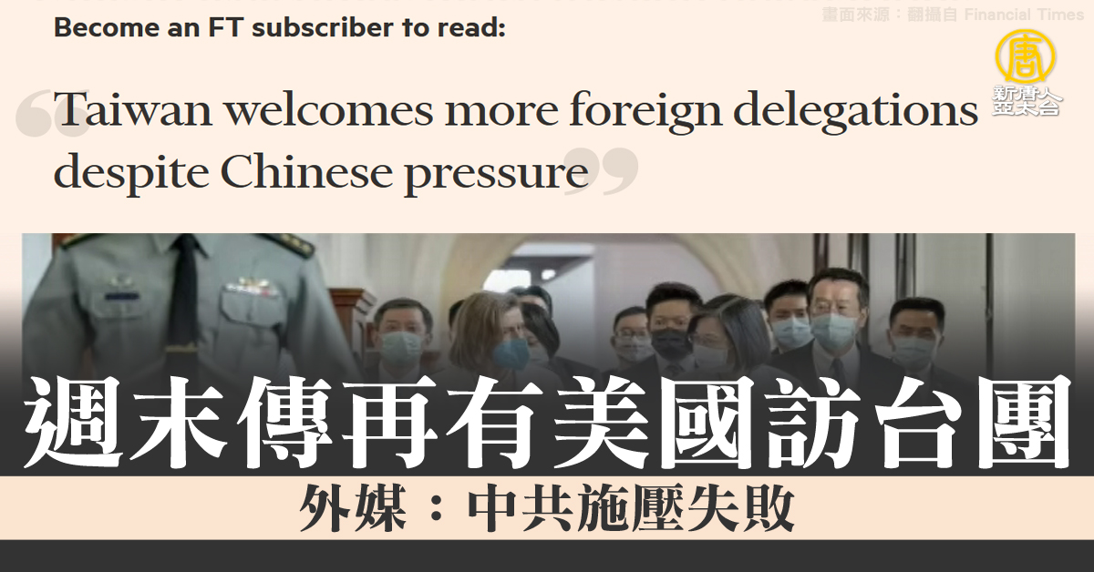 【新唐人亞太台 2022 年 08 月 22 日訊】好,美國眾議院議長裴洛西8月初訪台之後,接連幾週都有美國訪團來台,繼上週美國參議院外委會亞太小組主席馬基,這個禮拜是印第安納州州長侯康安,正在台灣訪問。英國《金融時報》報導,儘管中共施壓,台灣仍持續歡迎更多的外國訪團,並且透露下週末還會再有一團美國國會代表團訪台,將成為這個月第4度訪台的美國官員代表團,內文也引用前駐美國代表處政治組組長趙怡翔的話表示,中共企圖嚇阻各國政要訪台,不過它們失敗了。