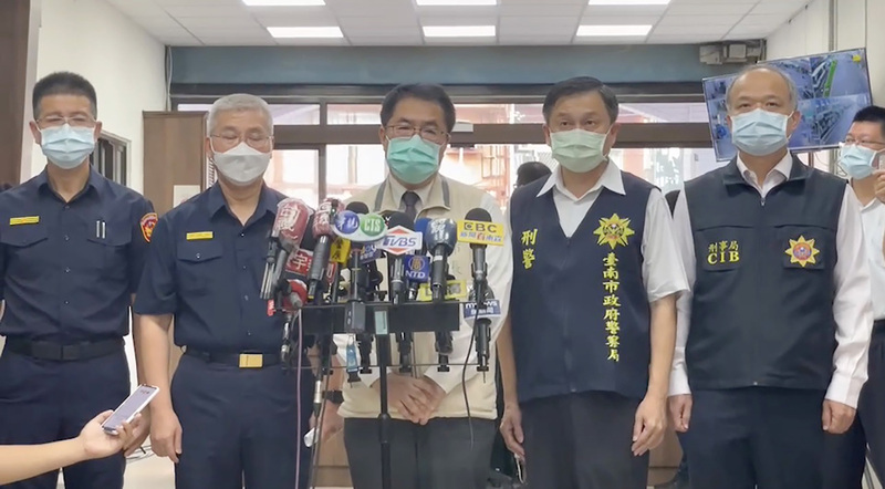 台南市長黃偉哲與台南市警察局長方仰寧上午8時30分一同舉行記者會,會前全體閉眼默哀,即使今天順利逮到殺害2名員警的凶嫌林信吾,現場仍感受到沉痛氛圍。
