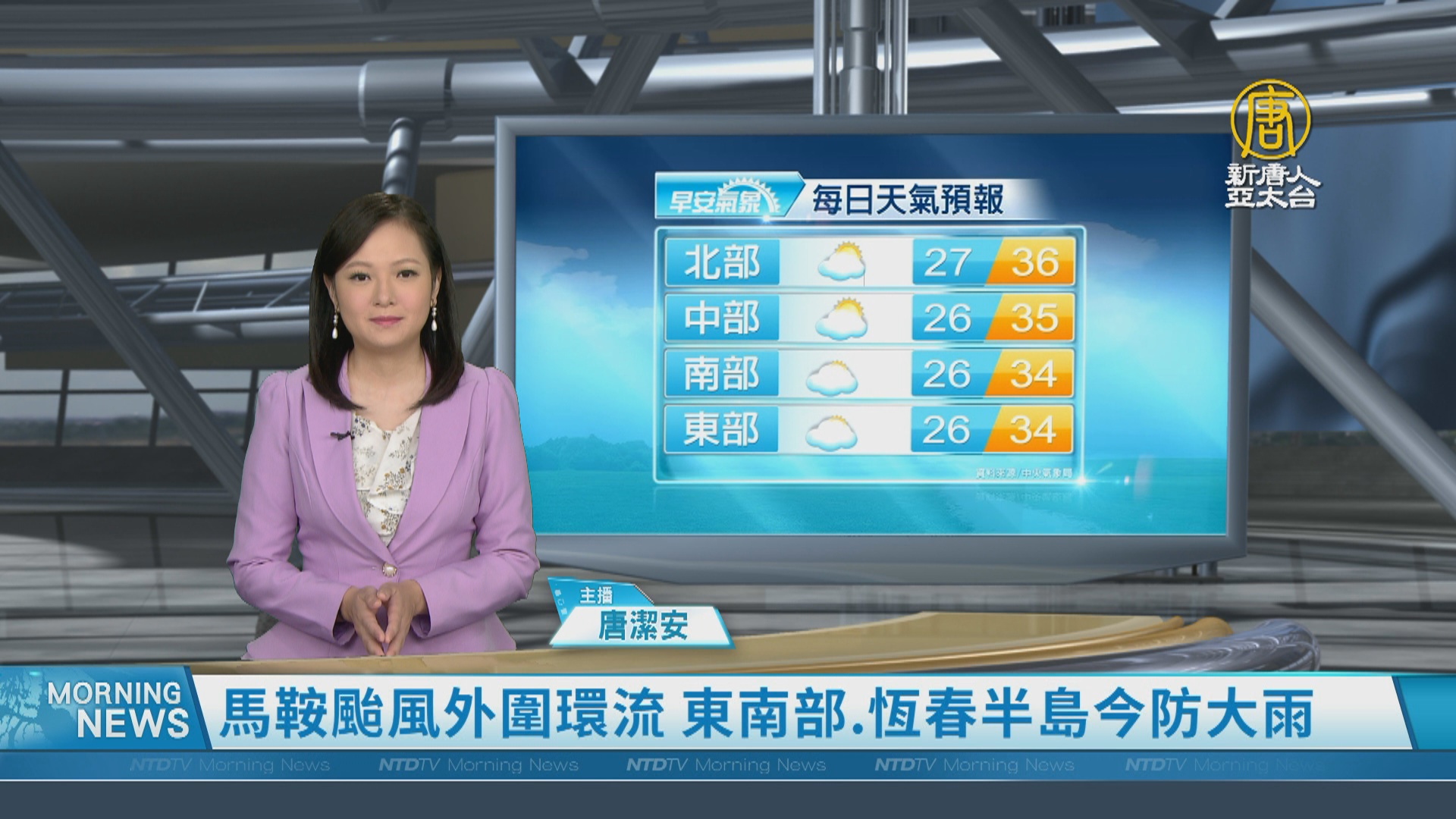 【新唐人亞太台 2022 年 08 月 24 日訊】歡迎您收看8月24日的早安新唐人,我是唐潔安,先來帶您關心天氣。第9號颱風「馬鞍」今天(24日)距離台灣最近,不斷有水氣靠近台東和恆春半島,而南部和東部也有機會下雨,其他地區多雲到晴,以午後雷陣雨為主。帶您一起來看到國際媒體重要訊息。