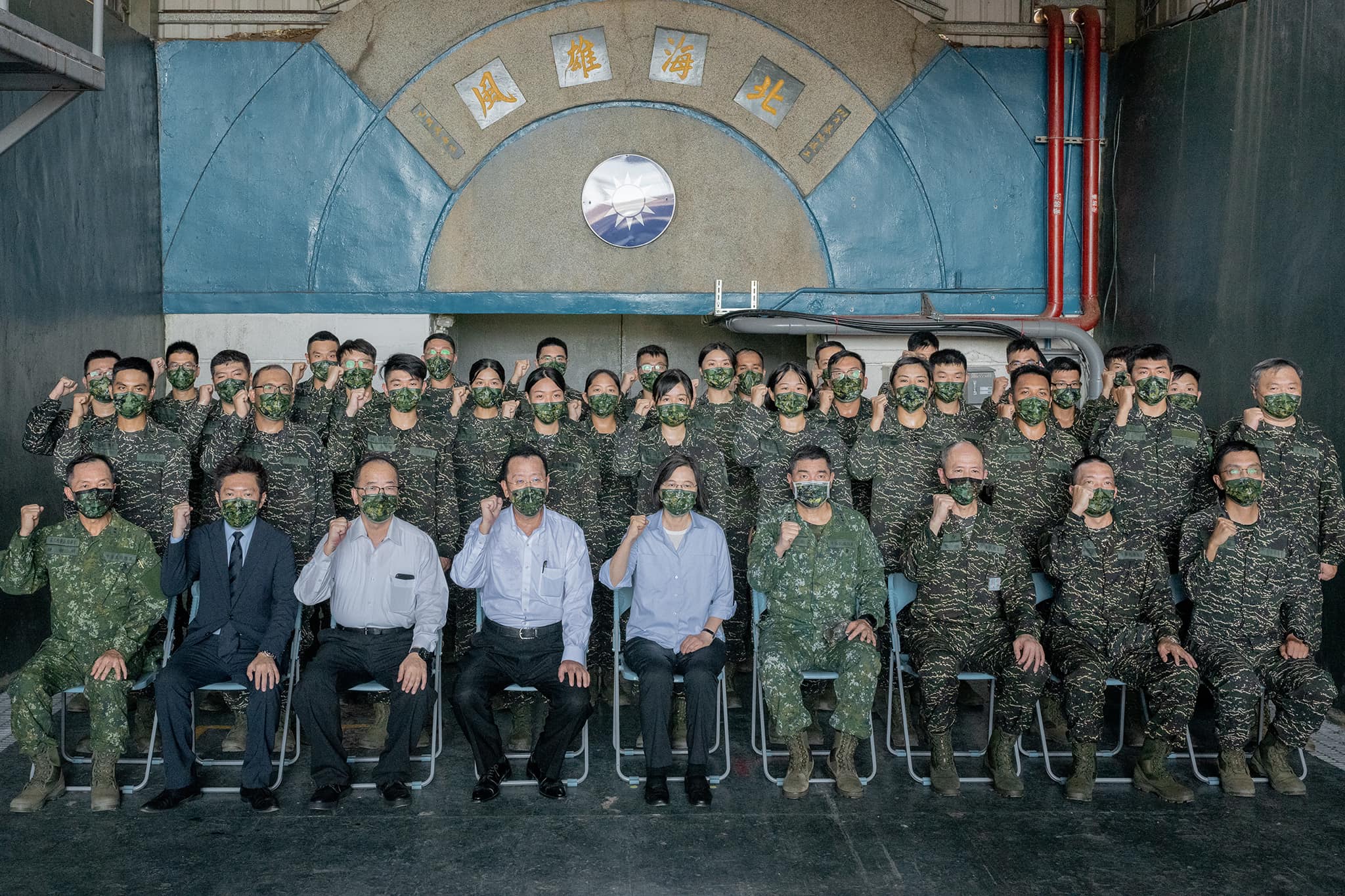 總統蔡英文(圖左五)24日說, 前陣子中共在台海周邊的騷擾挑釁,引發區域緊張情勢,國軍展現堅定不退縮勇氣沉著應對,值得國人為他們喝采。「有國軍的堅守崗位,才有我們如常生活 」。(圖/翻攝自蔡英文臉書)