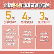 最後,溫明賢理事長呼籲5大危險族群,包括年齡較大的長者、有心血管疾病的患者、有家族病史者、擁有不良生活習慣的人及心衰竭病患,需注意4大異常徵兆,分別為「呼吸困難、頻繁心悸、不明原因胸悶胸痛及容易疲倦」,應盡早就醫檢查治療,並謹記「適量運動、健康飲食、壓力管理」,3招預防猝死!