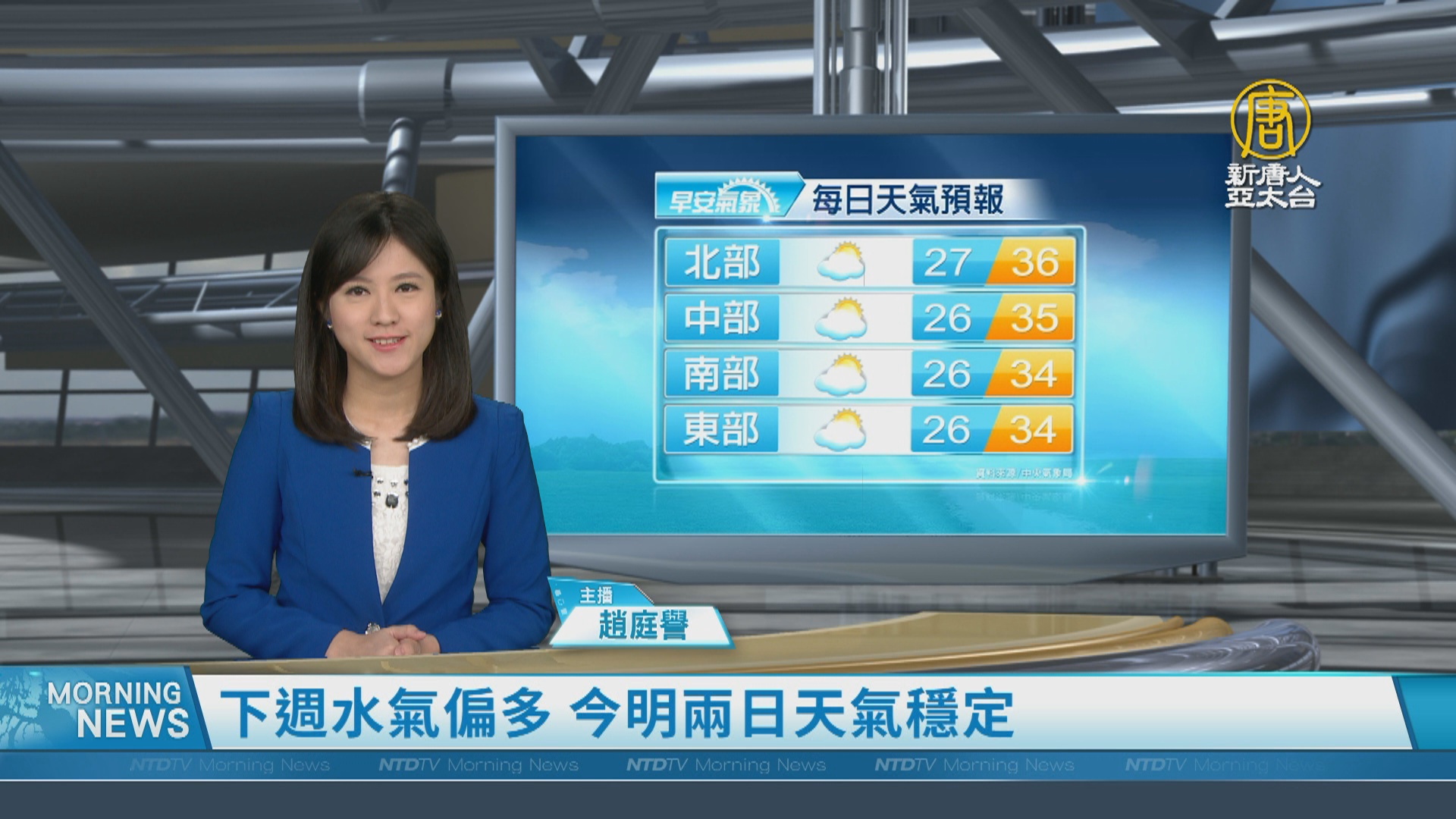 【新唐人亞太台 2022 年 08 月 26 日訊】歡迎您收看8月26日的早安新唐人,我是趙庭譽,先來帶您關心天氣。昨天因為午後對流雲系發展旺盛,雙北地區多處積水,氣象局表示,今明兩天都是晴朗穩定的天氣,適合在平地安排出遊,但是,週日會有一波微弱的北風南下,替北台灣沿海地區帶來零星降雨,下週開始整體環境水氣較多,天氣又轉變為不穩定的狀況。帶您一起來看到國際媒體重要訊息。