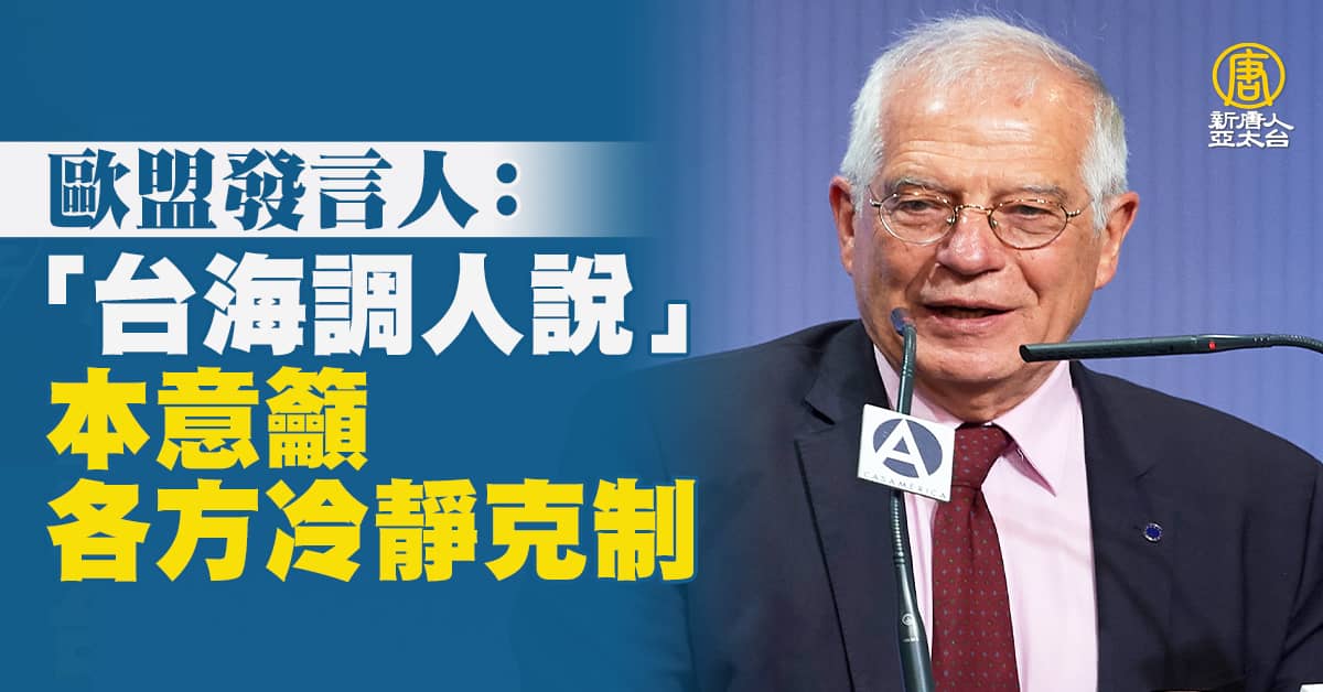【新唐人亞太台 2022 年 08 月 26 日訊】歐盟最高外交官波瑞爾22日一番「歐盟願調解台海危機」說法餘波盪漾。歐盟發言人回覆中央社表示,波瑞爾以西班牙語發言在翻譯後產生不少混淆,他本意是呼籲台海各方冷靜克制。