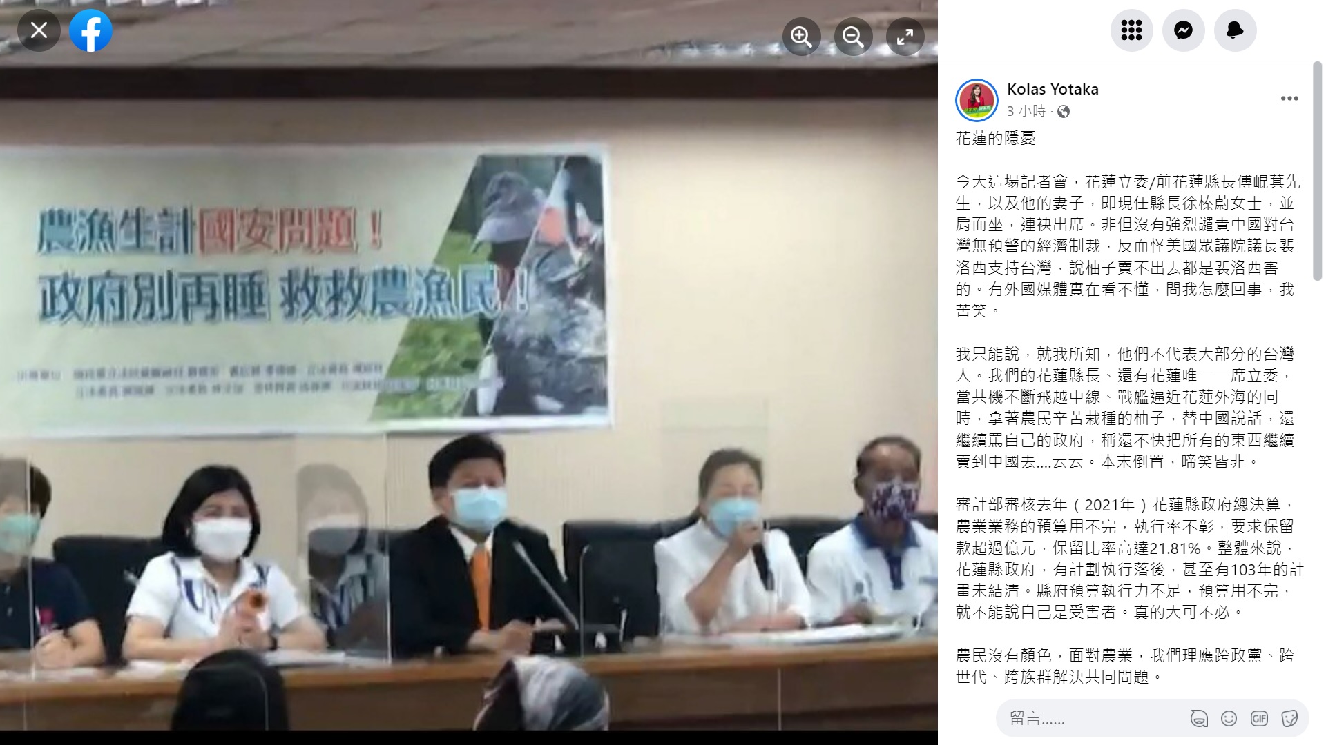 Kolas Yotaka透過臉書貼文指出,當共機不斷飛越中線、戰艦逼近花蓮外海的同時,花蓮縣長、花蓮唯一的一席立委,非但沒有譴責中國對台灣無預警的經濟制裁,反而怪裴洛西支持台灣,說文旦賣不出去都是裴洛西害的。