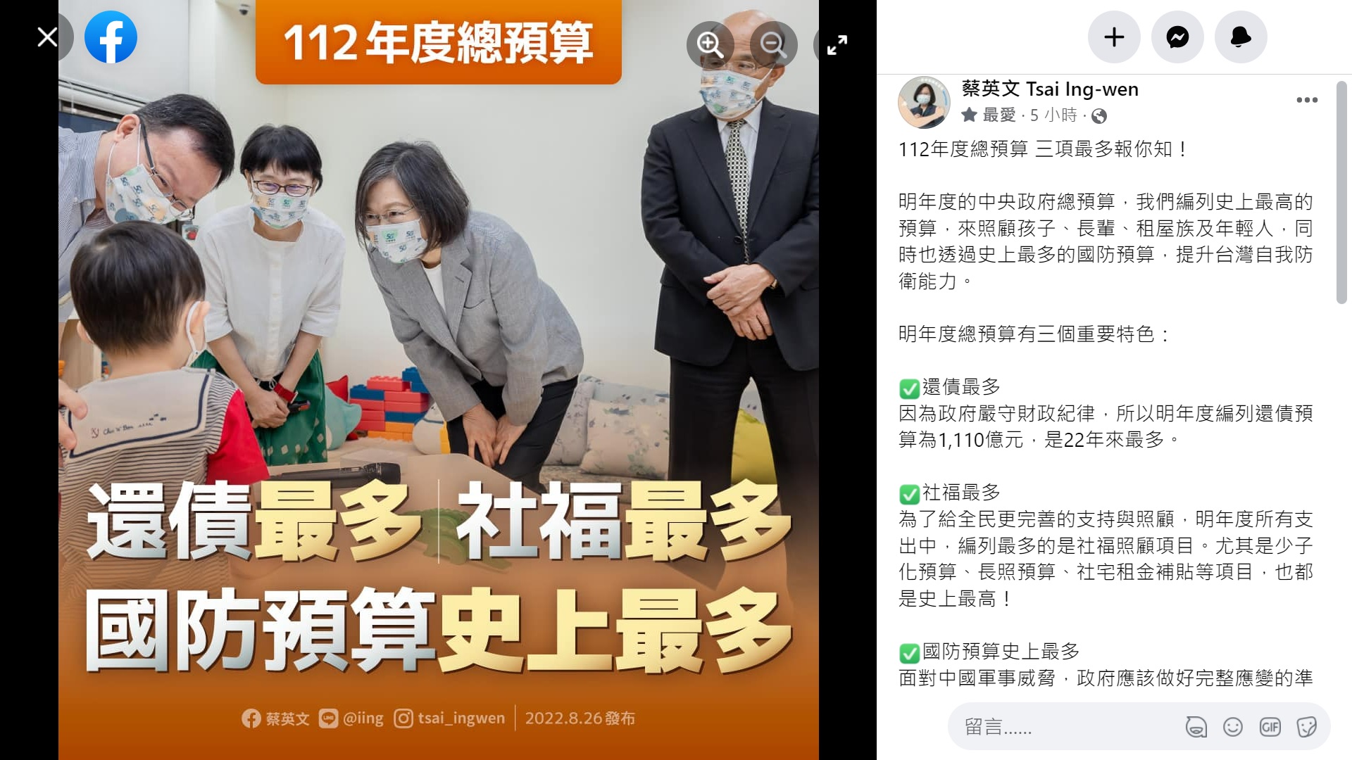 蔡總統透過臉書說,政府編列史上最高的預算,來照顧孩子、長輩、租屋族及年輕人,同時也透過史上最多的國防預算,提升台灣自我防衛能力。