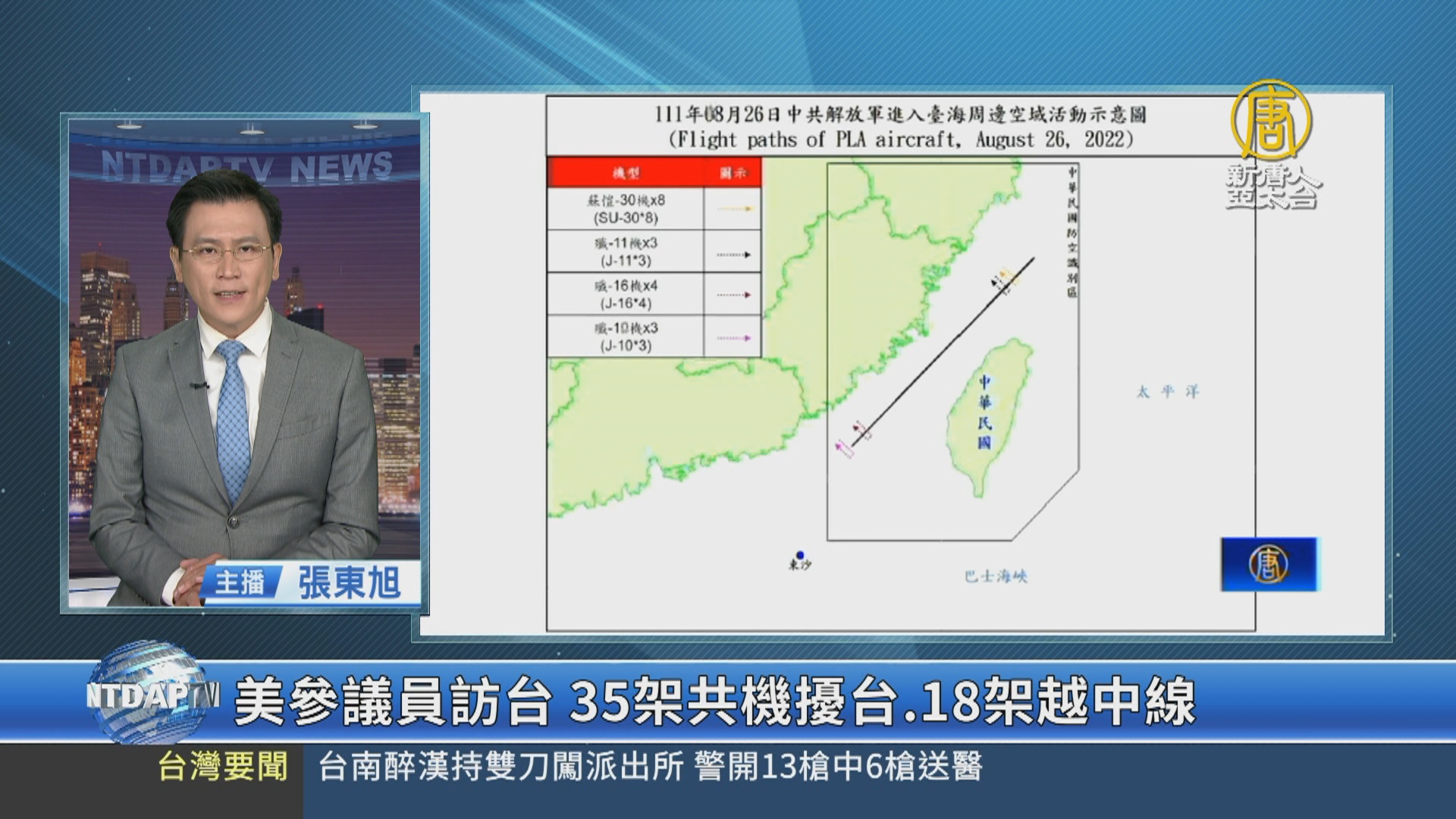 【新唐人亞太台 2022 年 08 月 26 日訊】歡迎回來。美國參議員布蕾波恩訪台,今天會見總統、發表演說,中共今天(26日)派出35架共機、8艘共艦擾台,其中18架共機闖越海峽中線與西南防空識別區。國軍運用任務機、艦,及岸置飛彈系統,嚴密監控與應處。