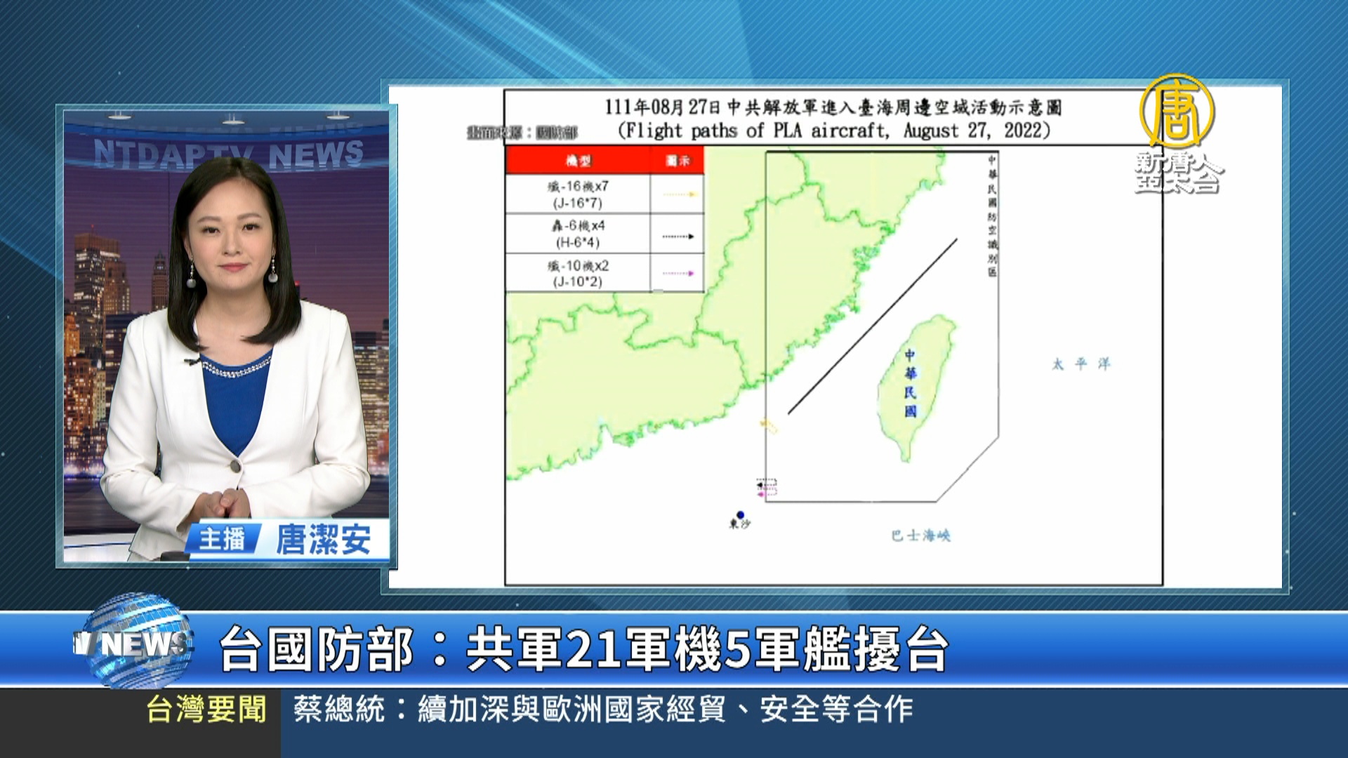 【新唐人亞太台 2022 年 08 月 27 日訊】歡迎回來,中共升高台海情勢,中華民國國防部今晚指出,截至今天〈27日〉傍晚5點,偵獲中共派出21架次軍機、5艘次軍艦持續在台海周邊活動,其中進入西南空域13架次,其中包含4架次「轟6」轟炸機;對此,國軍運用任務機、艦及岸置飛彈系統嚴密監控與應處。