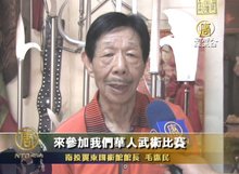 2011-07-02 21:15:40不只回歸正統中華廚技,新唐人也即將舉辦武術大賽,弘揚正統武術精神。帶您來看到,台灣武術界耆老,86歲的毛惠民先生,精通蔡李佛拳及各項兵器,強調以武德會友,在知道本台即將在8月舉辦全世界華人武術大賽,也同樣強調心性武德後表示:希望武術界的同好,都能踴躍報名參賽。