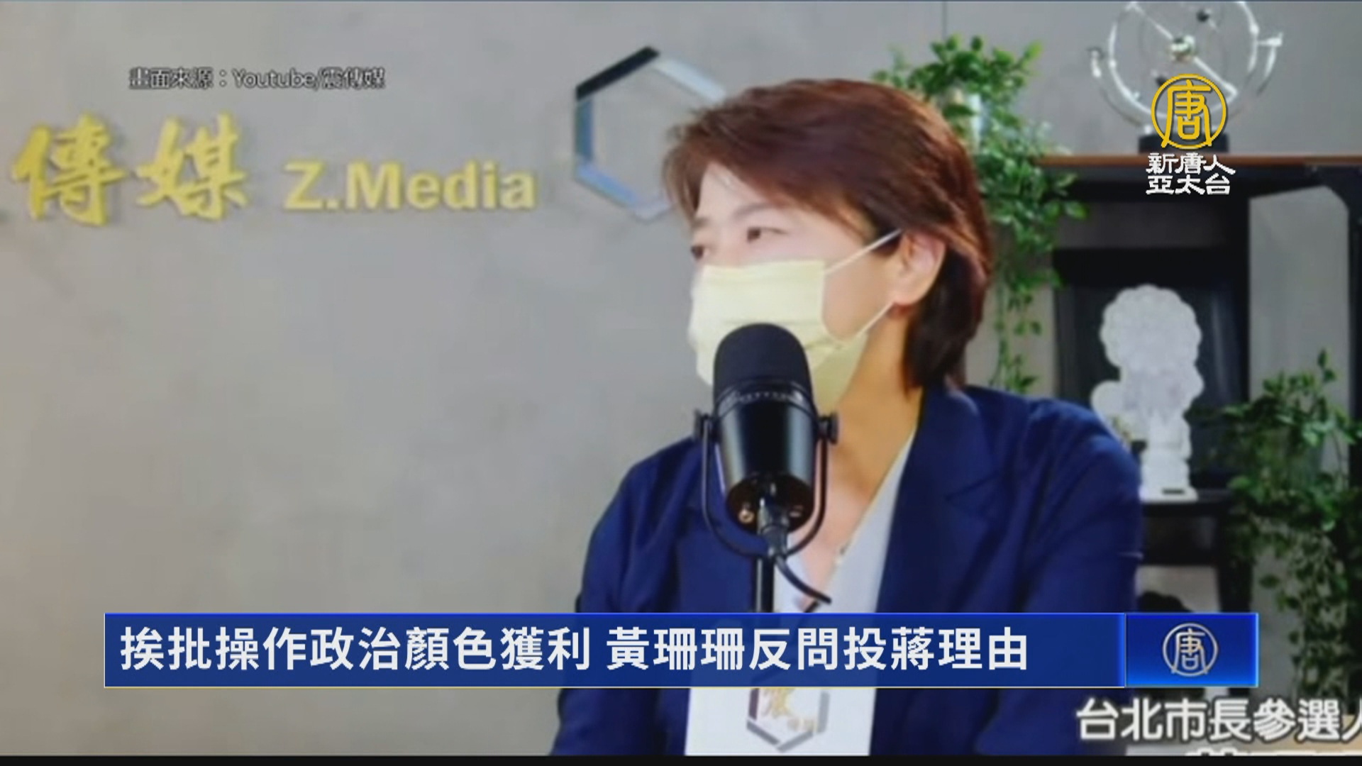 【新唐人亞太台 2022 年 08 月 29 日訊】黃珊珊參選台北市長,訴求擺脫藍綠,國民黨台北市議員游淑慧批評,黃珊珊操作顏色政治、從中獲利,因為黃珊珊出身新黨、2016年還獲蔡總統推薦,現在又成為柯文哲接棒人。黃珊珊今天(29日)在網路節目受訪,她說國民黨害怕基本盤鬆動,反問投票給蔣萬安的理由是什麼。