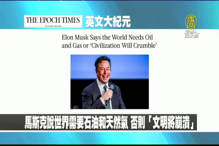 【新唐人亞太台 2022 年 08 月 30 日訊】首先來看到美國大紀元英文版報導:特斯拉執行長馬斯克表示,雖然應開發可再生能源,但世界仍必須開採石油和天然氣以維持文明。