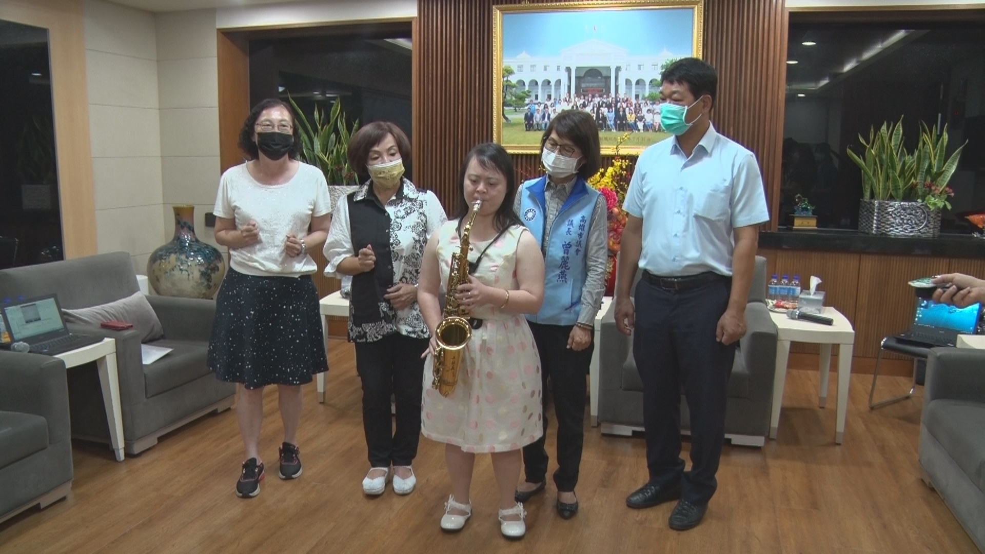 「燕飛翔慈善演唱會」記者會上,高市議會國民黨團總召童燕珍與無黨團結聯盟總召朱信強及高市議長曾麗燕一起合唱「愛拚就會贏」,也邀請32歲唐氏症患者周以嘉,演奏薩克斯風,呼籲大家一起做公益,多多幫助弱勢團體。
