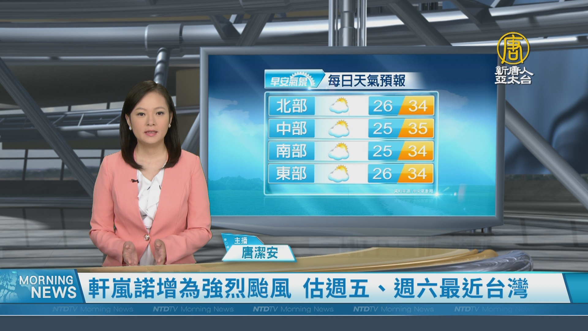 【新唐人亞太台 2022 年 08 月 31 日訊】歡迎您收看8月31日的早安新唐人,我是唐潔安,先來帶您關心天氣。今天各地高溫約33到35度,上午各地大多為多雲到晴,不過,午後中南部降雨較為明顯,雨勢有機會延續到天黑之後。另外,強烈颱風軒嵐諾,週五、週六之間可能經過台灣東北方外海向北走,週日進入東海並且持續遠離,「北轉角度與時間點」將是影響台灣天氣的關鍵,帶您一起來看到國際媒體重要訊息。