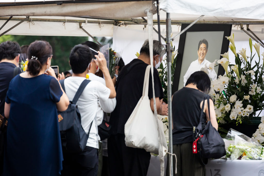 日本政府31日針對前首相安倍晉三「國葬」事宜開會,決定包括最多開放約6000人進場、9月27日下午2時舉行國葬儀式。圖為7月12日在東京,人們在增上寺參加前首相安倍晉三葬禮時示敬意資料照。 (圖/GettyImages)