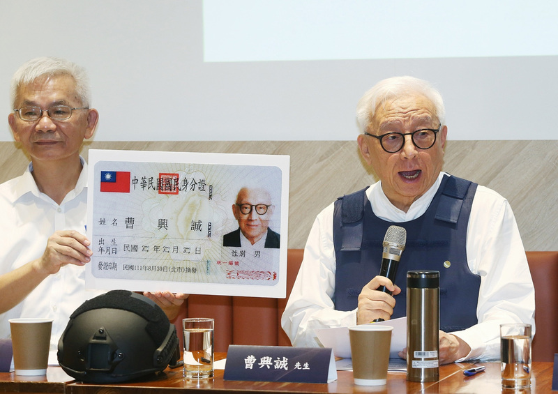 聯電前董事長曹興誠(右)1日在立法院舉行恢復中華民國國籍記者會,展示剛拿到的中華民國身分證。(圖/中央社)