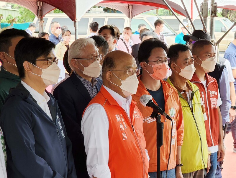 行政院長蘇貞昌(圖前左二)2日表示,不管哪國飛行器,未經允許擅入國境、一再警告不離去,一定依國際規範應處;這次擊落進入金門的無人機,是一再忍耐、警告後最適當的做法。 (圖/中央社)