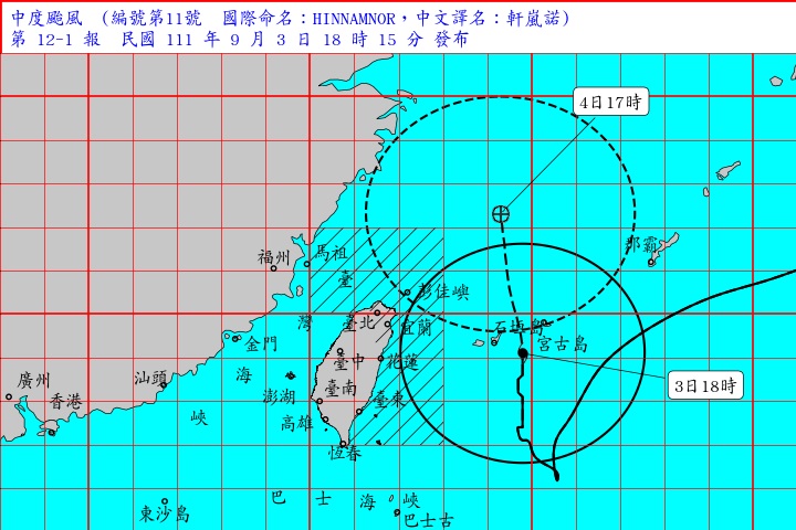 【新唐人亞太台 2022 年 09 月 03 日訊】颱風軒嵐諾靠近,中央氣象局說,軒嵐諾已經離台灣很近,最快今天晚間8時前暴風圈就會觸陸,降雨一直到明天上半天都會比較明顯,明天下半天後才會趨緩。