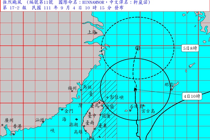 【新唐人亞太台 2022 年 09 月 04 日訊】氣象局今天表示,過去2小時軒嵐諾又略為增強,達強烈颱風標準,暴風圈也略為擴大;若依目前行進路線和速度預估,最快今天中午可以解除陸上颱風警報。