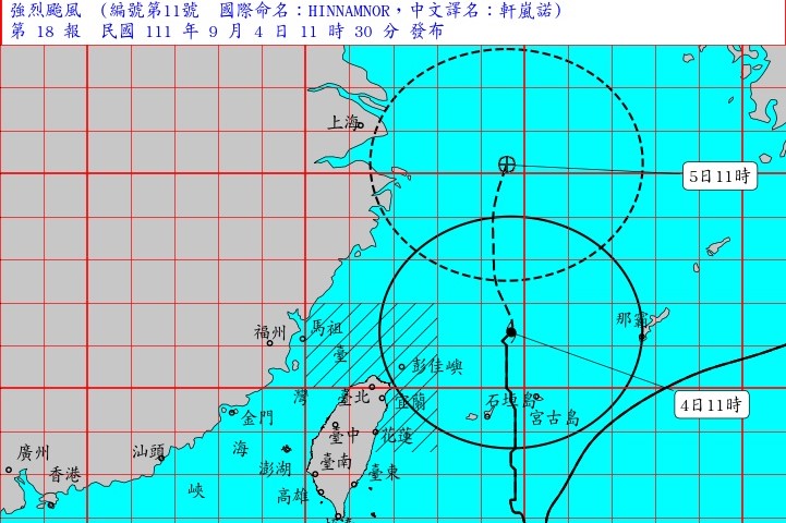 【新唐人亞太台 2022 年 09 月 04 日訊】根據中央氣象局最新資訊,強颱軒嵐諾持續北上,今天上午11時已解除軒嵐諾陸上颱風警報;由於預測軒嵐諾北上路徑呈稍微偏西弧線,因此預估解除海上颱風警報時間是今天入夜之後。