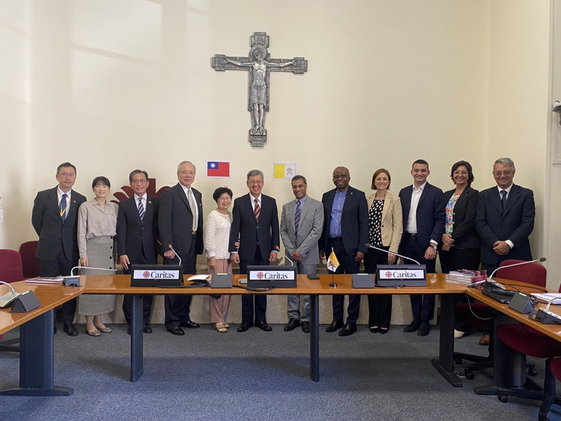 前副總統陳建仁(左6)擔任總統特使出訪教廷,拜會天主教國際明愛會總部,代表台灣捐贈3萬歐元協助援助烏克蘭難民工作。(圖/駐教廷大使館提供)