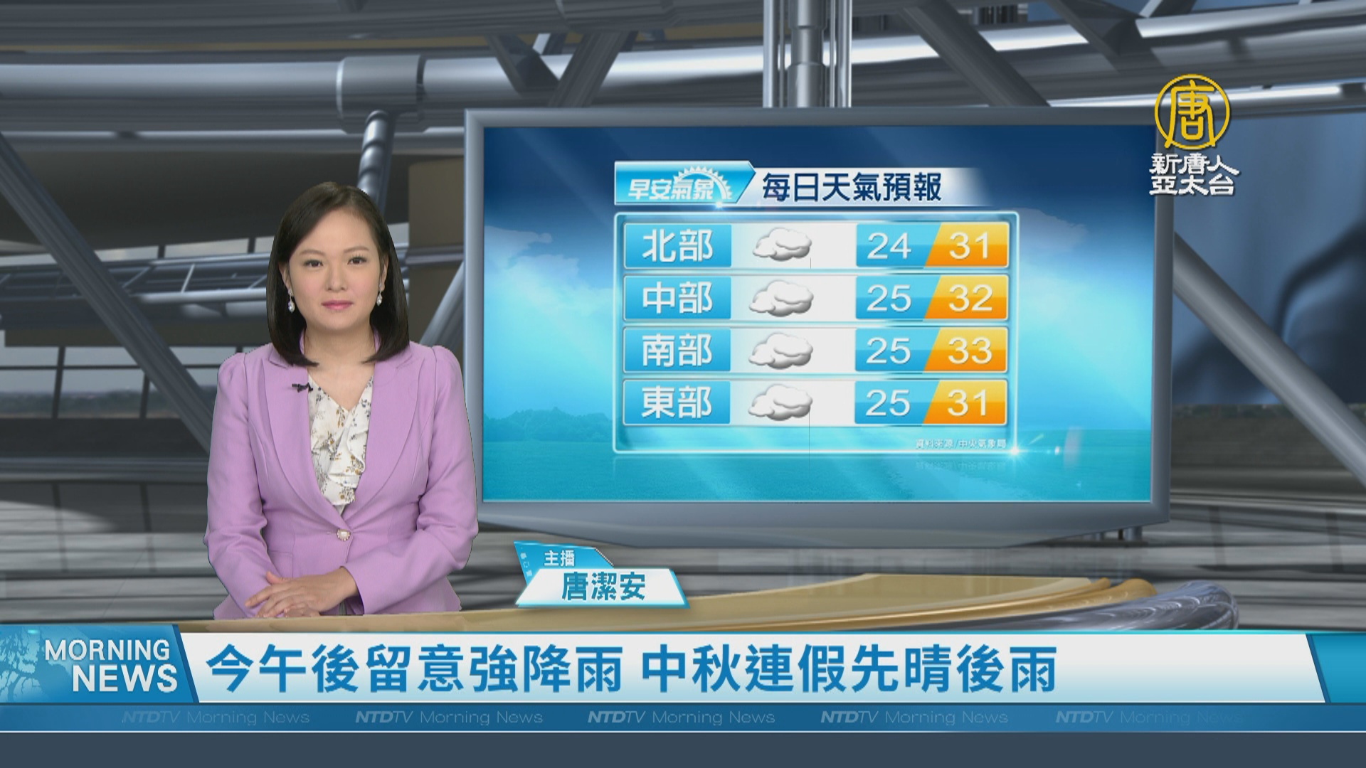 【新唐人亞太台 2022 年 09 月 07 日訊】歡迎您收看9月7日的早安新唐人,我是唐潔安,先來帶您關心天氣。今天白天各地高溫在30度至33度,午後降雨機會仍高,明天週四起水氣較少,多數地區可以看到陽光,中秋連假週五、週六持續穩定天氣,但星期天迎風面雲量增加,北部、東半部會有局部降雨。帶您一起來看到國際媒體重要訊息。