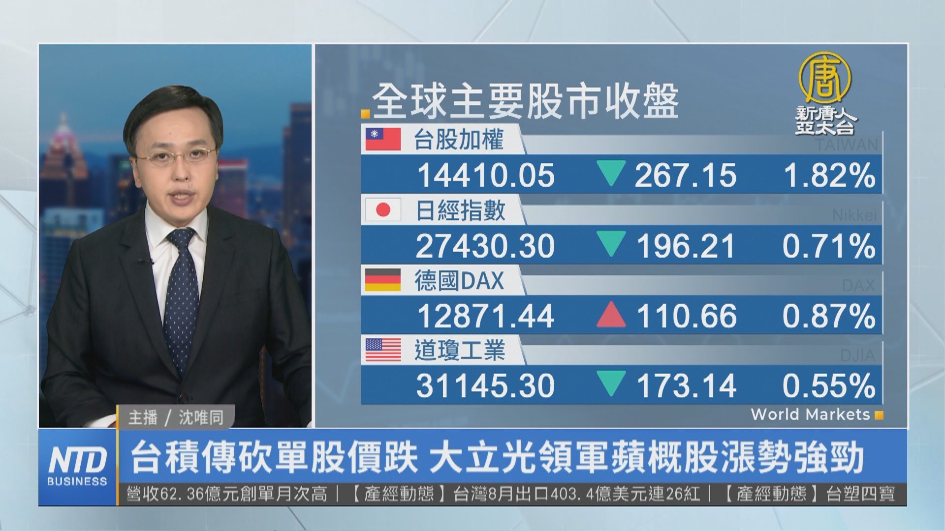 【新唐人亞太台 2022 年 09 月 07 日訊】新聞一開始帶您看到國際股市。受到美國聯準會可能激進升息的影響,美股收低,道瓊工業指數下挫173.14點,那斯達克指數下跌85.95點。台股今天同步走低,重挫超過200點,摜破14500點。台積電4大客戶砍單,傳聞將關閉4台極紫外光機台以減少產出,使得開盤重挫13元,來到476元 。另外,蘋果新機話題,蘋概三王台積電、鴻海都下跌,只有股王大立光股價翻紅,玉晶光、台光電、致茂等,漲勢也強勁。