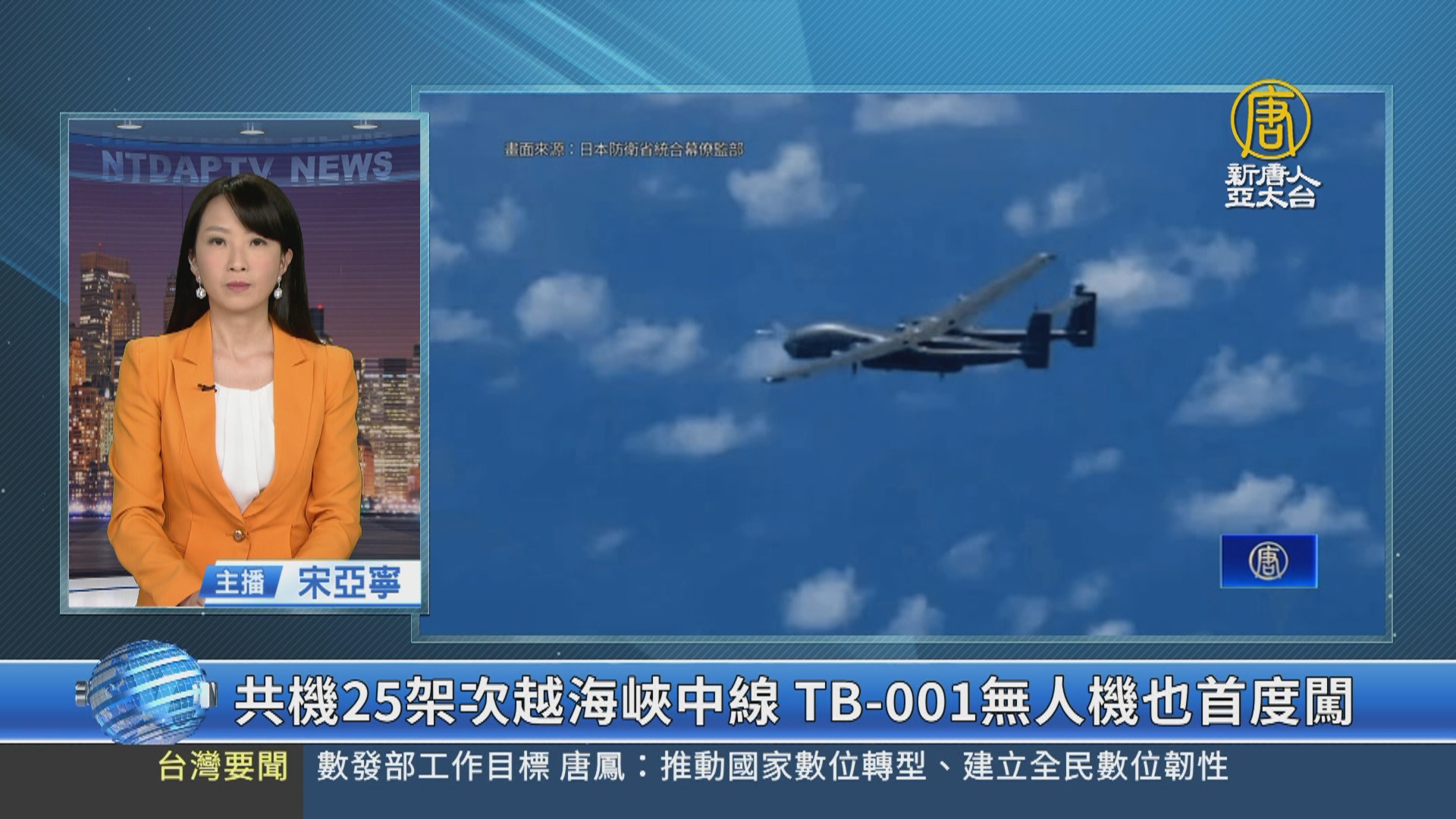 【新唐人亞太台 2022 年 09 月 08 日訊】在美國和法國國會訪團來台之際,國防部表示,截至下午5點,偵獲共機45架次、共艦7艘次,其中25架次越過海峽中線,包括1架偵查與攻擊型的無人機TB-001,這也是首次有共軍無人機飛越海峽中線,另外,也有多架次進入台灣西南空域,遭國軍運用任務機、艦及岸置飛彈系統嚴密監控與應處。