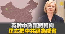 2022-10-13 11:21:17好,美國維持對中共強硬政策,英國新任首相特拉斯也將對中共採取更鷹派的立場,英國媒體報導,特拉斯在新的國防和外交政策中,將正式把中共視為「威脅」,這一立場更接近英國對俄羅斯的立場。報導指出,英國政府之所以要提前採取這項行動,是要終結內閣大臣對如何應對中共的困惑,因為前首相強生時代將中共視為「體制競爭對手」。