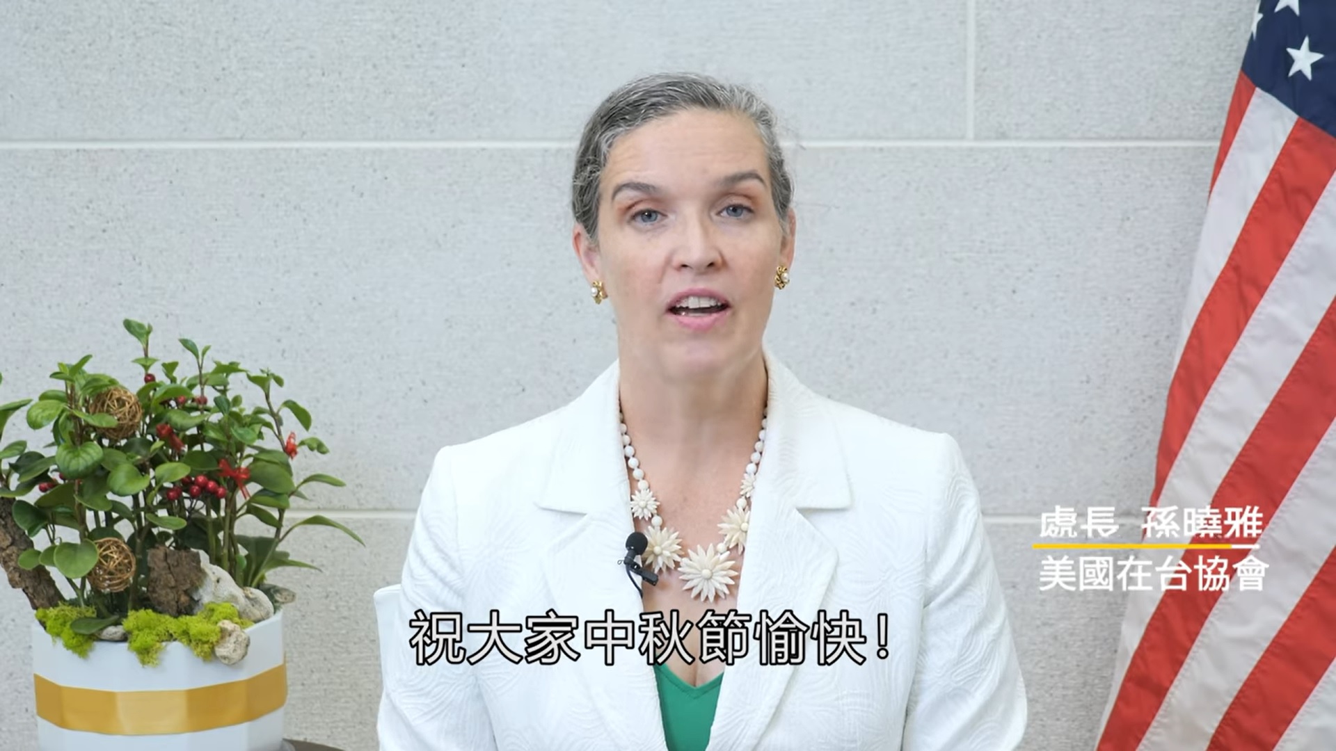 美國在台協會公布台北辦事處長孫曉雅就職週年紀念影片,孫曉雅全程以流利中文發言,除祝大家中秋快樂,也強調美台關係「堅若磐石」。(圖/翻攝自美國在台協會 AIT臉書)