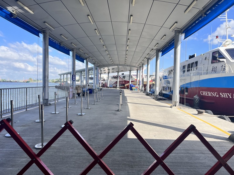 屏東地區受到颱風梅花外圍環流影響,12日上午雖然陽光露臉,但風勢漸大,東港碼頭只有工作人員走動,並無旅客。(圖/中央社)