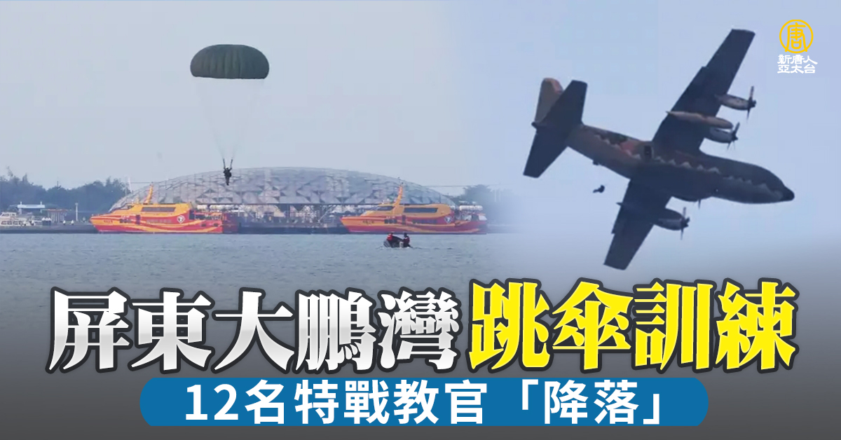 【新唐人亞太台 2022 年 09 月 14 日訊】屏東大鵬灣國家風景區,出現難得一見的跳傘訓練。台灣陸軍航特部空降訓練中心的特戰組,進行特種地形訓練,12名教官從1,250英呎高空的C-130運輸機陸續跳下,場面壯觀,吸引不少軍事迷起了大早來拍攝紀錄。