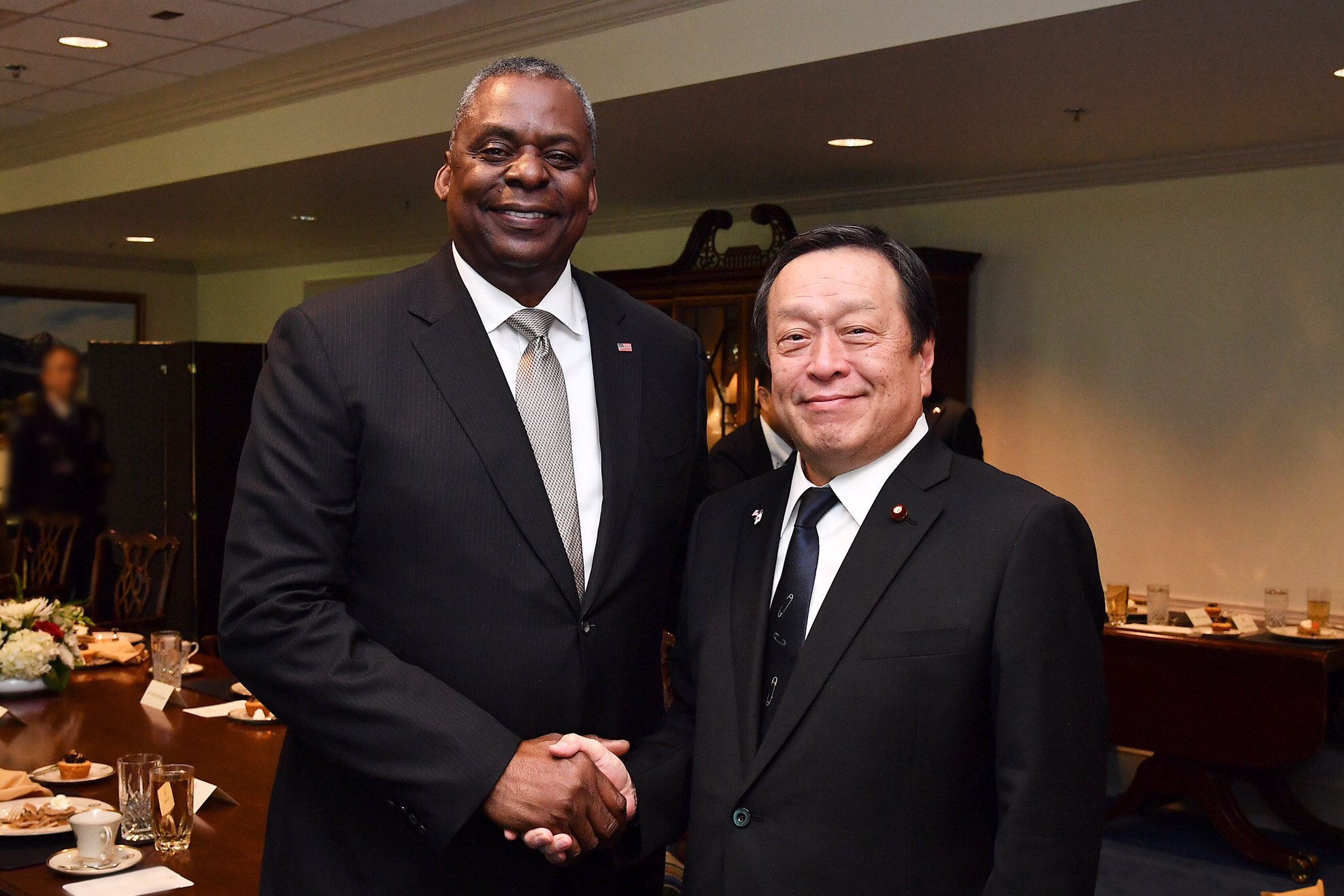 日本防衛大臣濱田靖一(右)14日在華府與美國國防部長奧斯汀(左)會談,兩人再度確認台灣海峽和平穩定的重要性,也都希望海峽兩岸問題和平解決。(圖/翻攝自推特@ModJapan_jp)