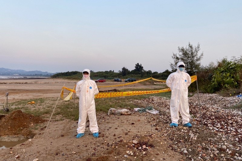 金門后沙岸際日前發現一頭境外漂流豬屍,採樣送驗後已就地焚化掩埋,檢體經檢測確認呈現非洲豬瘟病毒核酸陽性反應,農委會也公布自15日起到22日凌晨止,金門生鮮豬肉等禁止輸台。(圖/金門縣政府提供)