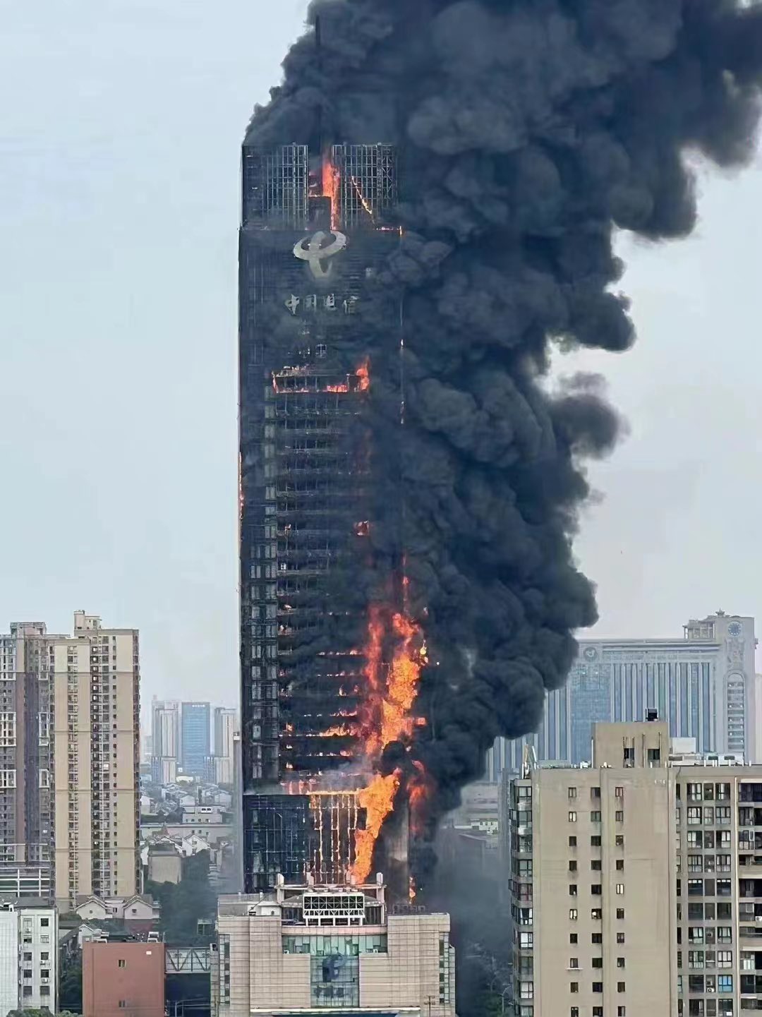湖南長沙一電信大樓大火 數十層樓體燃燒火勢猛烈