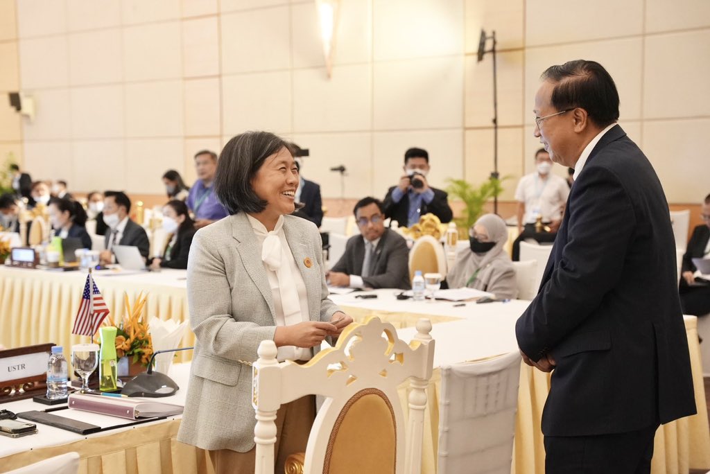 美國貿易代表戴琪(左)18日在柬埔寨暹粒參加一年一度的東協經濟部長-美國貿易代表協商會議。關於台美21世紀貿易倡議何時舉行首輪談判,她預計首輪談判很快就會進行,但還沒有一個具體的時間。(圖/翻攝自推特@AmbassadorTai)