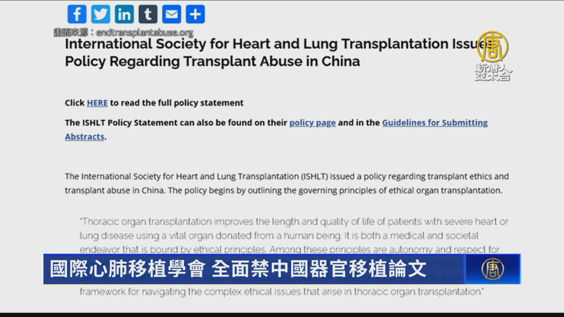 2022-09-19 13:53:46國際心肺移植學會(ISHLT)發表聲明,出台一項新政策,禁止發表任何來自中國的器官移植的研究論文。