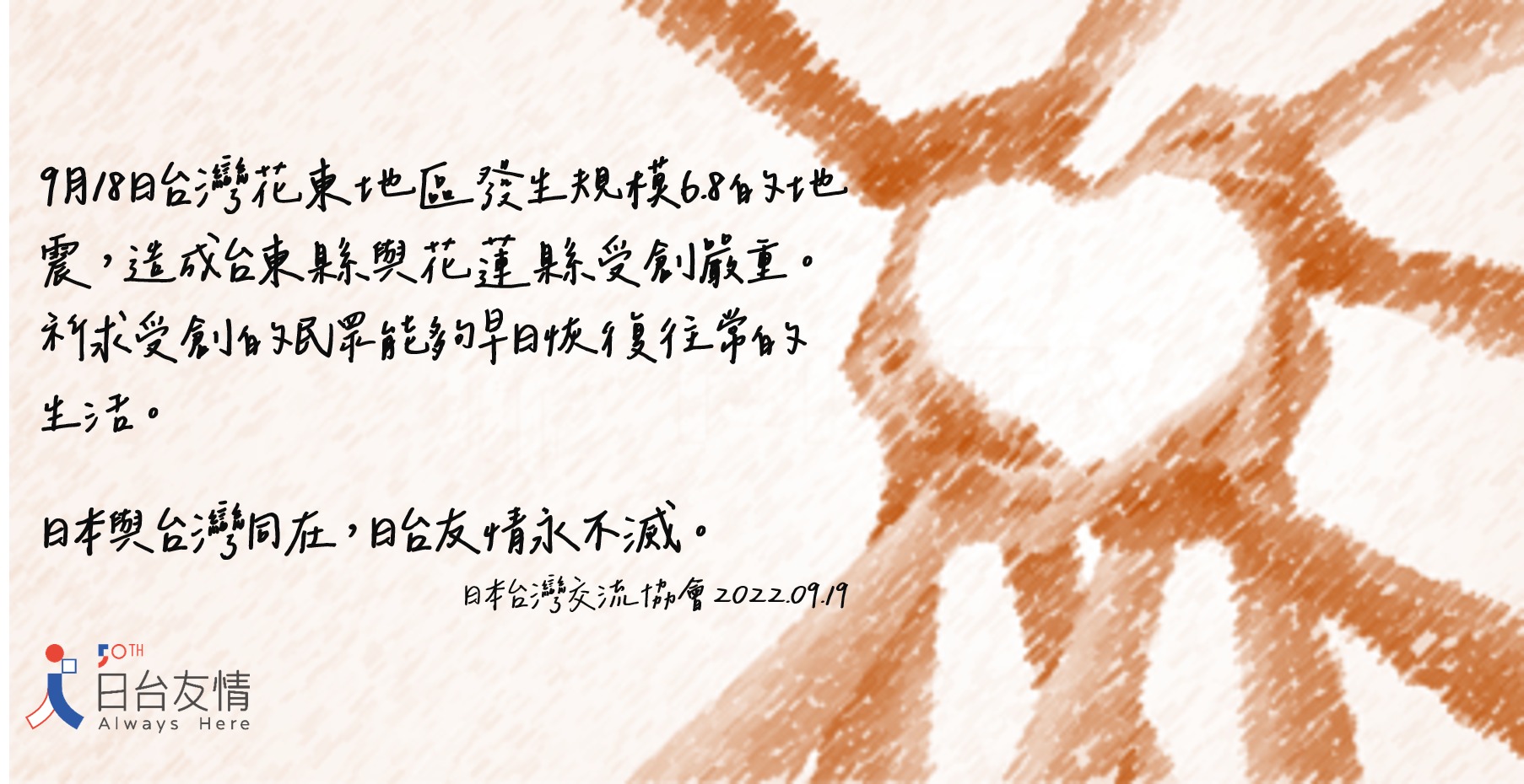 【新唐人亞太台 2022 年 09 月 19 日訊】日台交流協會今天表示,對於台灣花東地區18日發生芮氏規模6.8地震,協會會長大橋光夫與台北代表處代表泉裕泰分別致慰問函予總統蔡英文,祈求受創的民眾,能夠早日恢復往常的生活,日台友情永不滅。