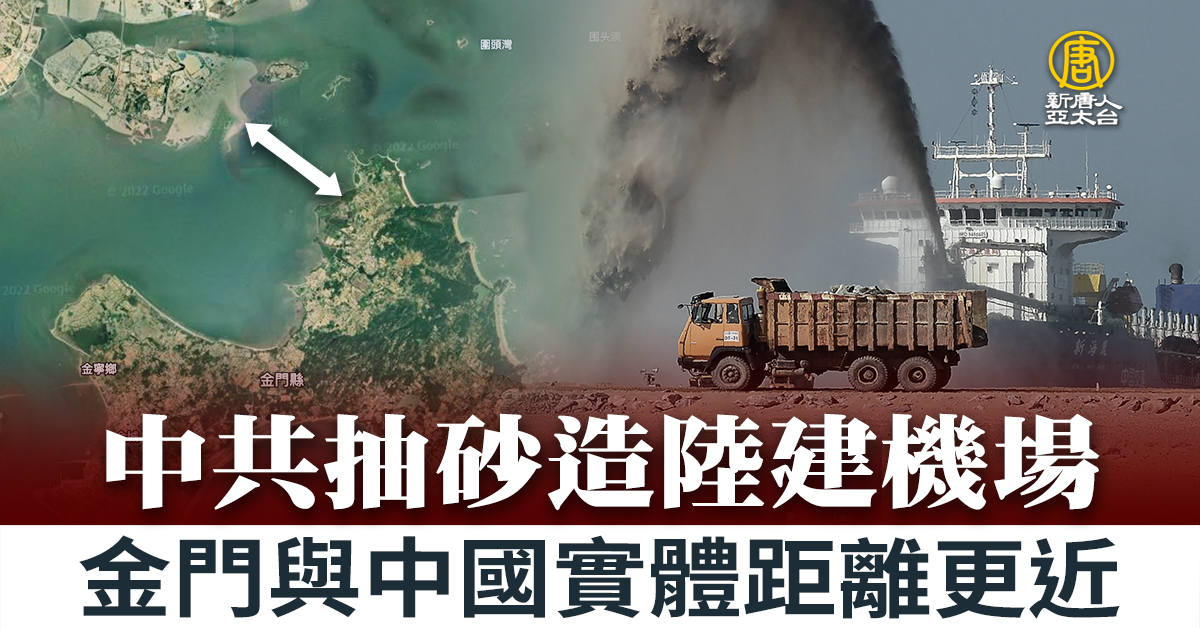 【新唐人亞太台 2022 年 09 月 20 日訊】中國大陸在金廈海域抽砂造陸,金門縣議員董森堡指出,大陸為建立翔安國際機場,其抽砂造陸致使大嶝島增加了近一倍的面積,讓金門與大陸實體距離越來越近。