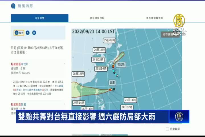 【新唐人亞太台 2022 年 09 月 23 日訊】歡迎回來。來關心天氣,今天太平洋上接連有2個颱風生成,輕度颱風塔拉斯在上午生成,朝北往日本附近移動;接著下午又有輕度颱風諾盧生成,將朝西往菲律賓附近移動,雖然太平洋形成雙颱共舞的局面,但氣象局預估,這兩個颱風對台灣都沒有直接影響。另外受到東北風影響,今晚到週六,基隆北海岸及大台北地區將轉為有雨,而台灣北部、東半部地區、恆春半島及馬祖也有局部短暫雨,週六午後南部地區及其他山區有局部短暫雷陣雨。