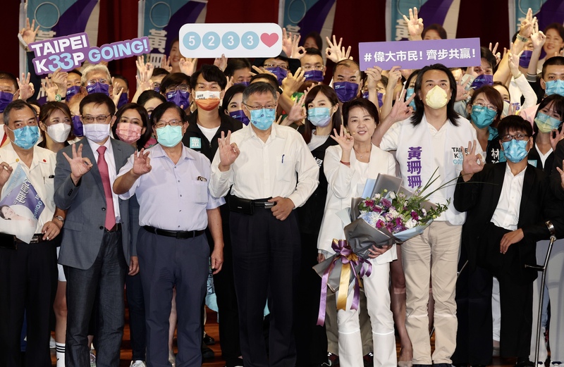 無黨籍台北市長參選人黃珊珊(前右3)25日在台北舉行競選總部成立大會,同時宣告競選團隊成員架構,由民眾黨主席、台北市長柯文哲(前右4)擔任競總榮譽主任委員,後援會總會長為前國立陽明大學校長郭旭崧(前左2),競總策略長(等同總幹事)則是台北市政府市政顧問翟本喬(前右2)。(圖/中央社)
