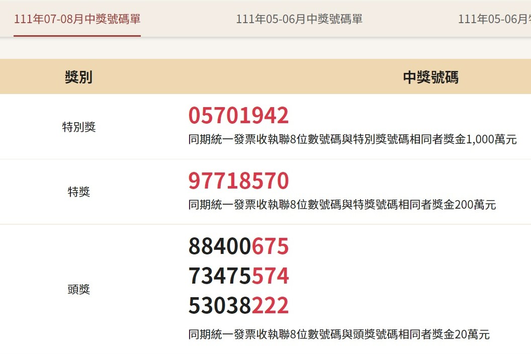111年7、8月統一發票中獎號碼今天公布,特別獎(1000萬元)05701942 ;特獎(200萬元)97718570;頭獎(20萬元)3組分別為88400675、73475574、53038222。