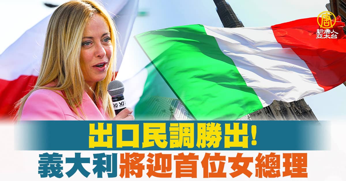 【新唐人亞太台 2022 年 09 月 26 日訊】早安新唐人國際最新消息來看到,義大利議會大選周日(25日)投票,出口民調顯示,右翼政黨領導人梅洛尼有望成為義大利首位女總理,她的政黨與右翼聯盟將贏得 41% 至 45%的選票。梅洛尼先前接受台灣媒體專訪表示,若她當選台灣將是重要關切事項,並將推動更多雙邊合作。而除了反對中共軍事挑釁台灣,她也直指無意再續簽與中共的「一帶一路」。