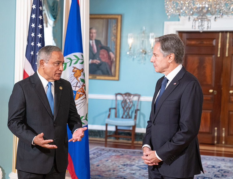 美國國務卿布林肯(右)26日在國務院會見貝里斯總理布里仙紐(左),感謝貝國與台灣維繫強健關係。(圖/美國國務院提供)