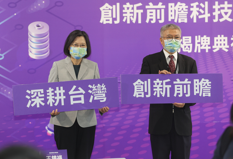 國立台北科技大學創新前瞻科技研究學院27日上午舉行揭牌典禮,總統蔡英文(圖左)、北科大校長王錫福 (圖右)出席。(圖/中央社)