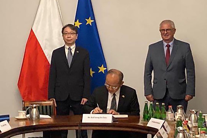 【新唐人亞太台 2022 年 09 月 27 日訊】在駐歐盟兼駐比利時代表蔡明彥,及波蘭經濟發展暨技術部次長皮霍雅克(Grzegorz Piechowiak)見證下,台灣與波蘭今天簽署合作備忘錄,正式成立半導體工作小組,將推動半導體合作。