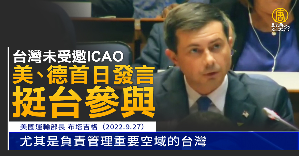 【新唐人亞太台 2022 年 09 月 28 日訊】國際民航組織ICAO大會,本週在加拿大召開。台灣在中共阻撓下沒有獲邀。不過在第一天議程,美國和德國都發聲支持台灣參與。中華民國外交部發言人歐江安表示,這是自2009年政府開始推動參與ICAO以來,美國運輸部長第一次在ICAO年會上發言支持台灣參與,別具意義;對於美國政府以公開、明確、有力的發言支持台灣參與ICAO,外交部表達誠摯感謝。
