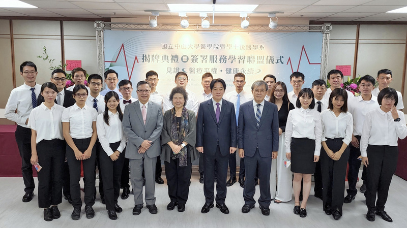 國立中山大學今天舉行醫學院揭牌典禮,並現場與多家醫院簽署成立服務學習聯盟,賴副總統、監察院長陳菊等人皆出席見證。賴副總統也授旗「中山大學馬雅各醫療服務團」,中山大學校長鄭英耀、首任醫學院長余明隆、後醫系主任陳彥旭代表接旗,帶領學士後醫學系學生宣示「醫療平權、終身承擔」。