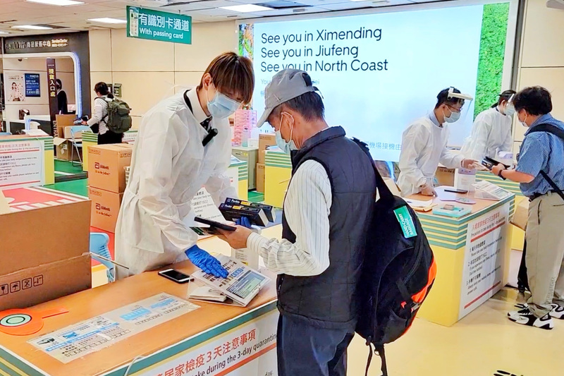 10月13日起入境人員免居隔改為「0+7」,無症狀旅客入境後可搭大眾運輸工具,自主防疫期間快篩陰性者可於餐廳內獨自或與特定對象共餐。 圖為桃機入境時由國際港埠人員向旅客發放家用抗原快篩試劑。(圖/中央社)